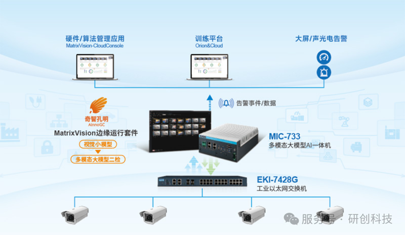 這是一款基于研華高性能邊緣計算平臺MIC-733,深度集成創新奇智視覺小模型與多模態大模型的邊緣智能終端,通過創新的“視覺識別 + 深度語義理解”融合分析路徑,具備強大的本地視頻智能分析及大模型深度研判能力。