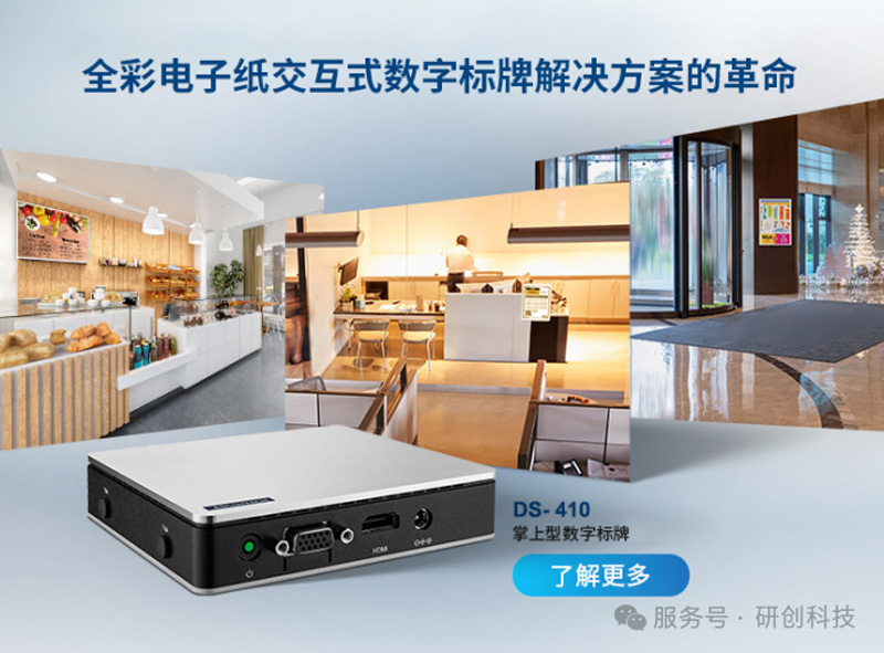 近日,研華科技推出全彩電子紙交互式數(shù)字標(biāo)牌解決方案DS-410,以創(chuàng)新技術(shù)和智能化設(shè)計(jì)重新定義行業(yè)標(biāo)準(zhǔn),為零售、企業(yè)及公共服務(wù)領(lǐng)域提供高效、節(jié)能的數(shù)字化展示方案。同時(shí)該方案以Spectra 6TM技術(shù)為核心,融合了超低功耗電子紙?zhí)匦耘c智能邊緣計(jì)算能力,為行業(yè)帶來”綠色智”的革新體驗(yàn)。