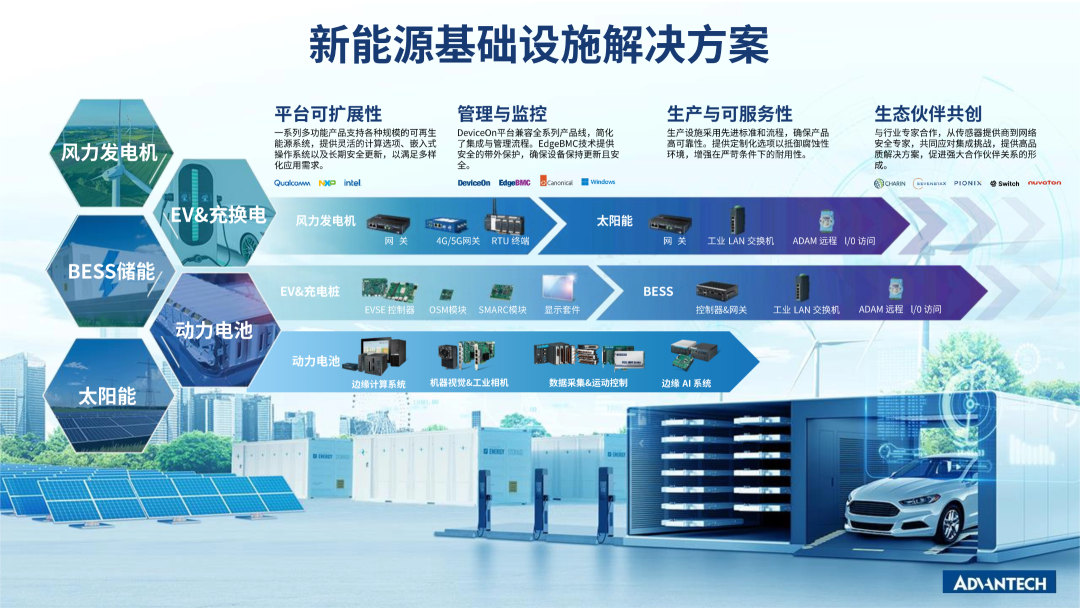 研華科技深耕新能源發電、儲能與用電全鏈條,為整車制造、動力電池、風光儲及配套設備等核心環節,提供專用控制器、邊緣計算、智能網關及數據采集設備,打通全鏈路數據,實現高效協同。依托覆蓋全球的服務網絡與全流程支持體系,協助客戶從容應對各地合規要求與運維挑戰,以“產品+服務”雙輪驅動,賦能新能源產業安全、高效布局全球。
