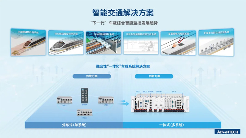 在傳統(tǒng)的監(jiān)控方式中,通常每個應(yīng)用場景配備一臺IPC,當(dāng)用戶需要增加系統(tǒng)密度并且具備更靈活的維護(hù)以及硬件升級能力時,傳統(tǒng)分散式IPC 布局架構(gòu)會較難滿足要求。與此同時,隨著現(xiàn)代軌道交通系統(tǒng)發(fā)展,監(jiān)控的目標(biāo)數(shù)量和精度要求都在不斷提高。另一方面,IPC的安裝位置也成為了一大難題,由于空間有限,這些IPC通常被安裝在列車的中間設(shè)備柜、車頭或者車尾的各個角落,甚至乘客座位底下。當(dāng)需要增加更多設(shè)備數(shù)量以滿足算力需求時,有限的安裝空間和散熱能力往往成為最大瓶頸。為優(yōu)化軌道交通的綜合監(jiān)控系統(tǒng),必須尋找更高效、更集成的解決方案。