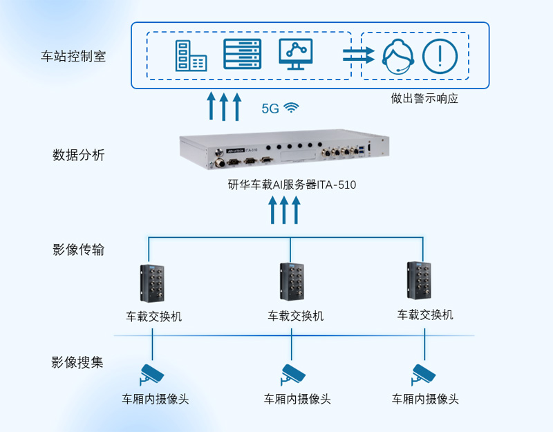 國(guó)內(nèi)某線路地鐵采用研華ITA-510作為其智能化列車的前端分析預(yù)處理單元。通過(guò)安裝在車廂內(nèi)的感知攝像頭,實(shí)時(shí)采集高清圖像視頻數(shù)據(jù),通過(guò)ITA-510強(qiáng)大的AI算力,進(jìn)行前端圖像視頻的預(yù)解碼分析處理,利用計(jì)算機(jī)視覺(jué)技術(shù)和圖像處理算法來(lái)識(shí)別車廂內(nèi)的實(shí)時(shí)擁擠狀況。再將結(jié)果數(shù)據(jù)傳輸?shù)杰囕d服務(wù)器進(jìn)行分布、處理,最后通過(guò)車地的超高速通訊將處理數(shù)據(jù)上傳至云平臺(tái),來(lái)實(shí)現(xiàn)車站客戶端的應(yīng)急聯(lián)動(dòng)乘客流量引導(dǎo)等精細(xì)化調(diào)度作用。運(yùn)營(yíng)方可以通過(guò)乘客信息系統(tǒng)或者APP對(duì)外發(fā)布,引導(dǎo)乘客有序乘車。同時(shí),該系統(tǒng)也可以對(duì)車上的異常行為做監(jiān)測(cè),比如乘客沖突,安全事故等,可第一時(shí)間報(bào)警或者通知工作人員。智能化的攝像頭充當(dāng)了列車內(nèi)的安全員,可以有效減輕地鐵運(yùn)營(yíng)方的員工作業(yè)強(qiáng)度,降低運(yùn)營(yíng)成本,提升運(yùn)行效率。